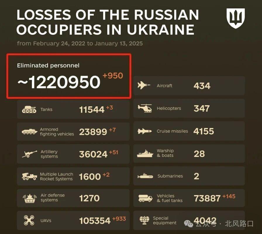6、【新纪录诞生,俄军损失超过122万】1月13日,乌克兰总参谋部发布俄军损失数据,俄军损失新增950人,累计损失超过120万,达到1220950人。
